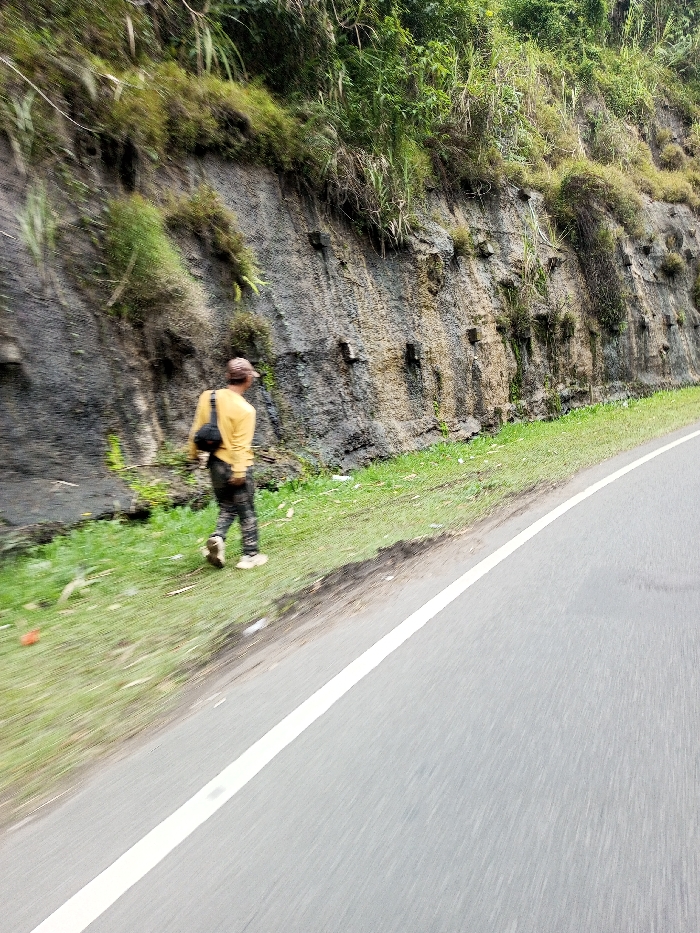 An individual walks on a grassy verge beside a paved asphalt road in Adhanur, India. The road features a solid white edge line and curves gently to the right, showing motion blur on its surface. The person, an adult, wears a yellow long-sleeved shirt, camouflage trousers, light-colored shoes, and a light-colored baseball cap, with a black shoulder bag slung across their back. They are moving away from the camera, towards a steep, dark gray rocky embankment that rises on the left. This embankment exhibits distinct horizontal layering and numerous square-shaped protrusions embedded into its surface, with green vegetation growing from crevices and covering its top section. Small pieces of litter are visible on the grassy verge.