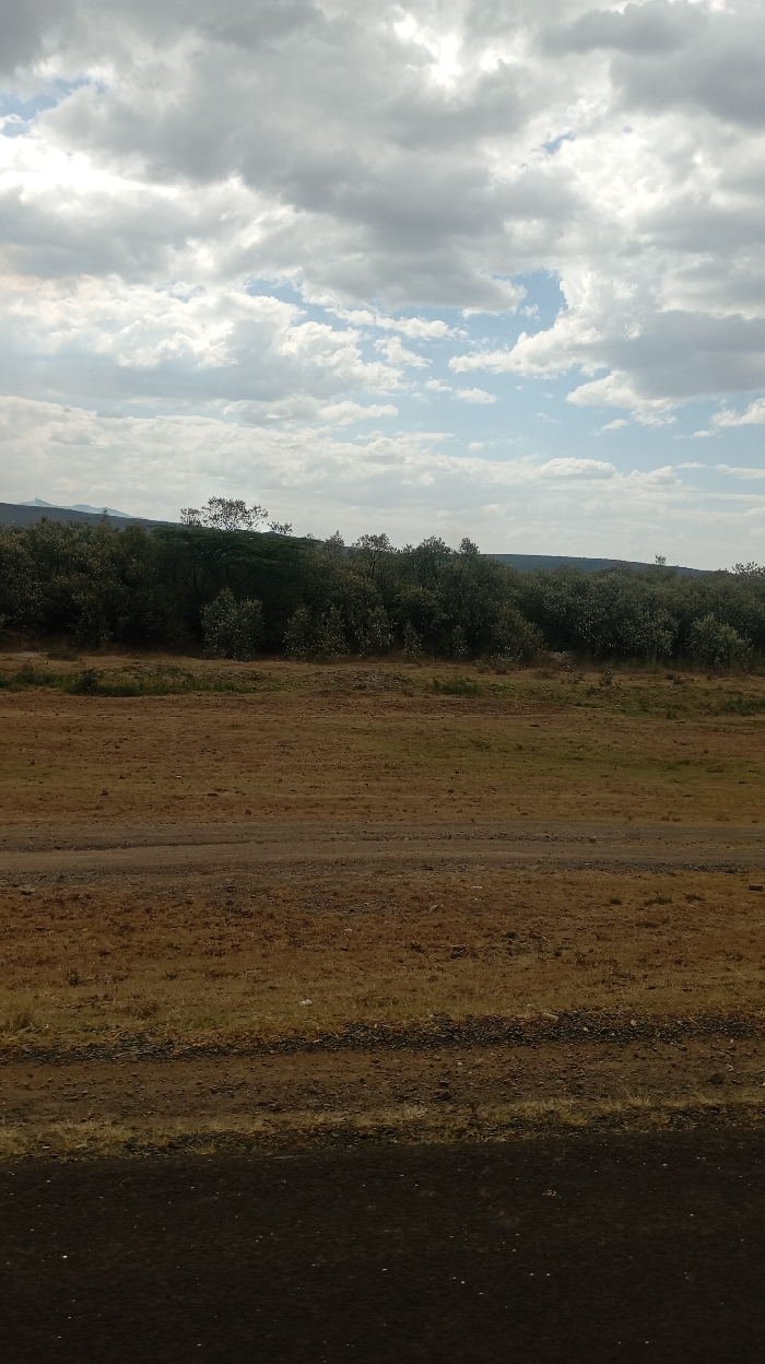 A landscape shot reveals a scene beneath a cloudy sky. A field of dry grass and dirt stretches toward a distant line of trees atop a small hill. The lower portion of the frame shows a paved surface. The sky is partially covered with gray and white clouds, and a patch of blue is visible.