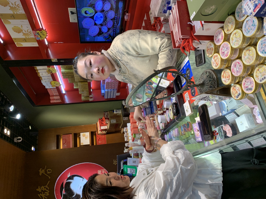An indoor retail scene within a cosmetic store, likely located in Shangcheng District, China, is depicted