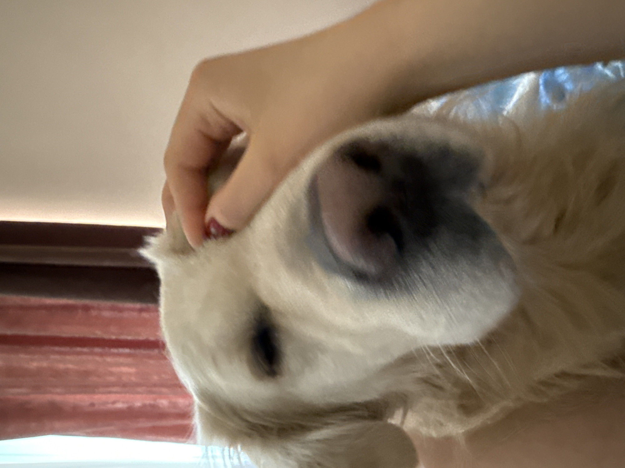 A close-up, somewhat distorted perspective depicts a golden retriever dog being petted by a person. The dog's nose and part of its face are the primary focus. The person's hand is visible, with a reddish manicure on one fingernail. A background features a window with drawn, reddish-brown shades. It is not possible to definitively ascertain the location as Zovuni, Armenia without further contextual details.