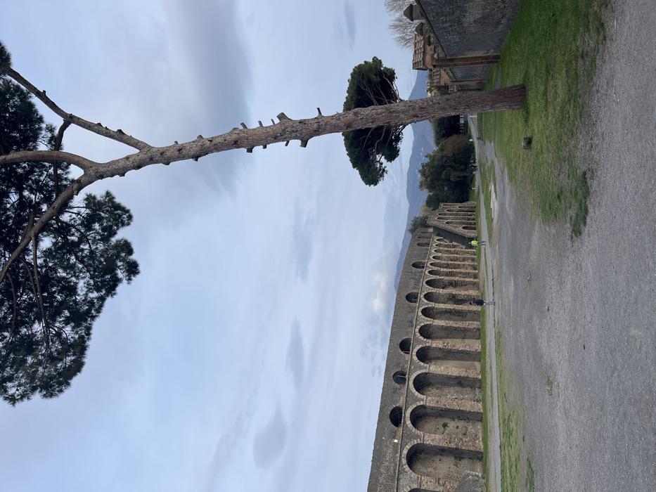 The image depicts an outdoor scene within the archaeological site of Pompeii, Italy, specifically featuring the Large Palaestra