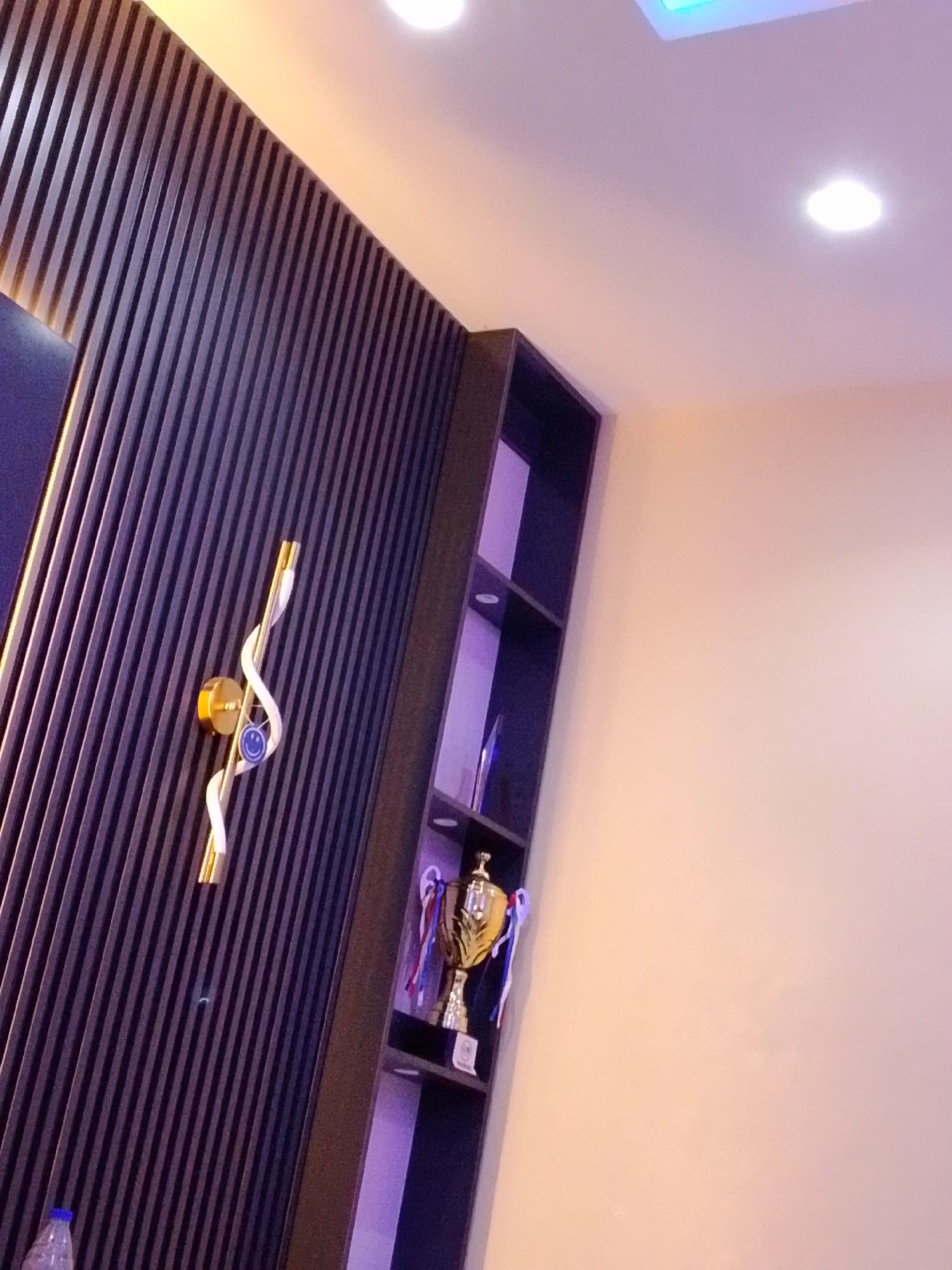 This image depicts an indoor scene in what is stated to be Uyo, Nigeria. The left portion of the frame features a dark-colored wall with vertical slatted panels. Mounted on this slatted wall is a gold-toned wall sconce, characterized by an abstract, wavy design, and incorporating a circular blue element with a white smiley face. Immediately to the right of the slatted wall is a dark brown, multi-compartment vertical shelving unit. On one of the shelves, a gold-colored trophy adorned with red, white, and blue ribbons is prominently displayed. Other shelves contain various unidentifiable objects, some appearing reflective blue. The ceiling, painted a light color, contains two illuminated circular recessed lights and a rectangular panel emitting a blue light. The wall on the right side of the frame is a plain, light-colored surface. A blue-capped plastic bottle is partially visible in the bottom-left corner. No individuals, discernible actions, or interactions are present in the scene.