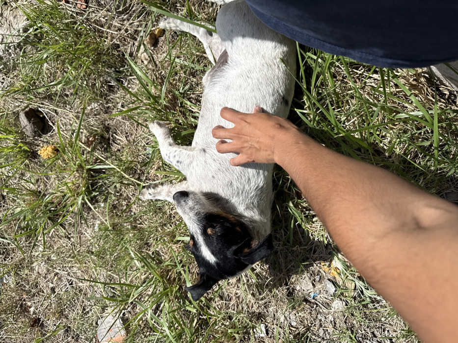 A white dog with black spots and black ears is lying on its back in the grass. A person's arm and hand reach down to pet the dog's belly. The dog is resting in a patch of grass with dry spots and green blades. The person is wearing a dark blue shirt.