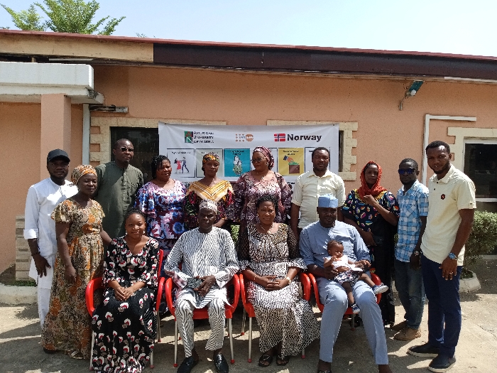 A group of 13 people stand and sit in front of a building in Yola, Nigeria, at the coordinates 9.259 latitude and 12.466 longitude. They are positioned in front of a large sign with the word "Norway" and the Norwegian flag. The sign is on the side of a peach-colored building with a concrete walkway in front of it. The people are all dressed in various styles of clothing. Some of them are smiling and others have serious expressions. Four people are seated in red chairs, and one person holds a small baby. The people are diverse, with varying skin tones and hair colors. There is a small amount of vegetation in front of the building.