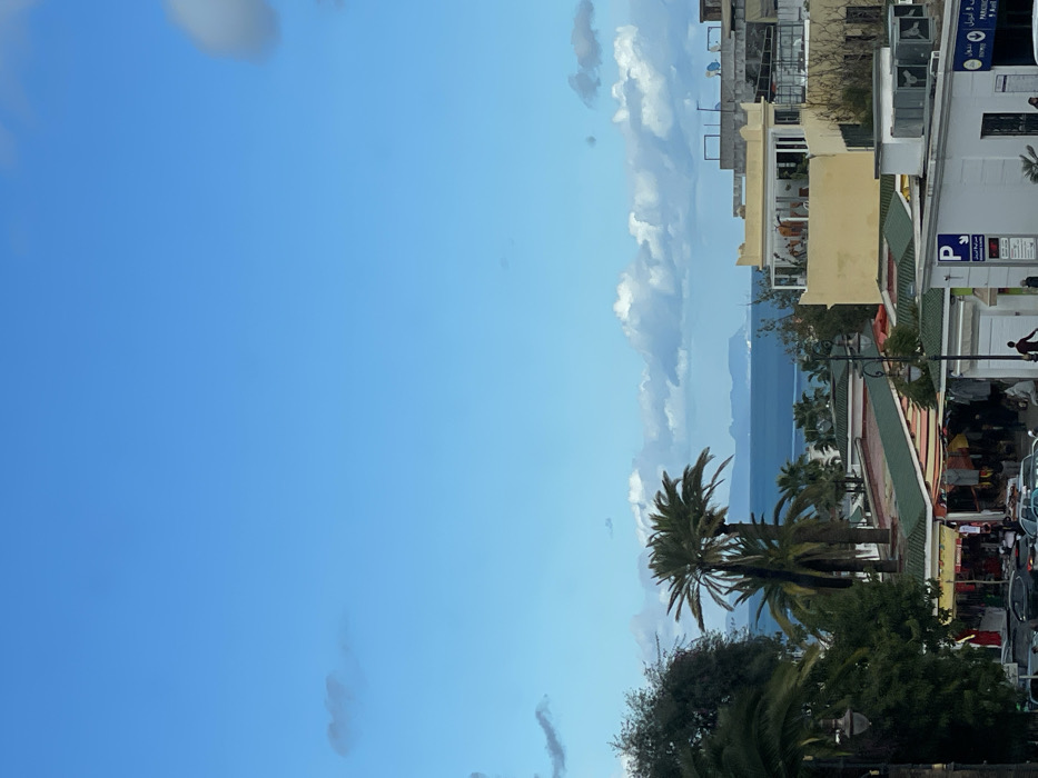 This image depicts a panoramic view of a coastal urban environment in Tangier, Morocco, looking north-northeast across the Strait of Gibraltar towards the Iberian Peninsula. The scene is captured under a bright blue sky with scattered white cumulus clouds. In the foreground, the lower portion of the image shows a street-level perspective. On the left, dense green foliage from various trees, including tall palm trees, partially obscures the view. Below these trees, a paved street is visible with several parked and moving vehicles, including a dark-colored car, a light blue car, and a silver car. A row of market stalls with striped awnings (green, orange, and red) lines the street, displaying various goods, possibly clothing. Several indistinct human figures are present near these stalls, indicating pedestrian activity. Towards the lower right, a multi-story building with a white facade features a dark blue sign displaying a white 'P' symbol for parking, accompanied by Arabic text and "PARKING DE LA PLAGE" (Parking of the Beach). The Arabic text on the sign also includes "Asilah". Adjacent to this building is another structure with a yellow facade and green trim. A dark-clad individual is walking right-to-left on the sidewalk in this area. The midground features numerous prominent palm trees, behind which a sandy beach is visible, stretching towards the dark blue expanse of the sea. The sea occupies a significant portion of the mid-distance, with the faint white wake of a watercraft observed on its surface. In the far background, across the water, the distinctive silhouette of the Rock of Gibraltar is clearly visible on the right horizon, along with other landmasses of the Iberian Peninsula under a hazy sky. Above the horizon, the upper two-thirds of the image are dominated by the clear blue sky with additional scattered cloud formations.