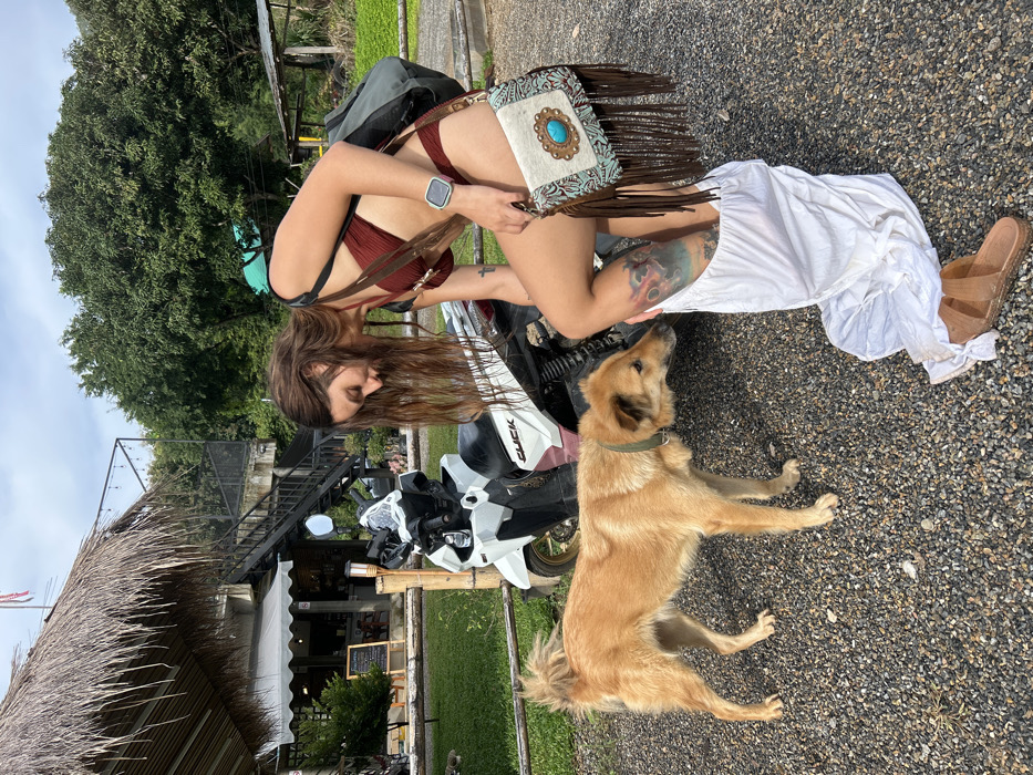 The image captures an outdoor scene in Ban Mae Ping, Thailand. A female subject with long, wet brown hair, wearing a red two-piece bikini, a dark backpack, and a brown fringed shoulder bag adorned with a turquoise stone, is bending forward. A white garment is positioned around her ankles and feet, indicating she is in the process of putting it on or taking it off. A visible tattoo is present on her left upper thigh. A medium-sized, light brown dog with a green collar stands near her, sniffing at her left leg and the white garment. On the gravel ground, a pair of brown sandals rests near her feet. In the background, a white Honda Click scooter is parked next to a building featuring a thatched roof, a white awning, and an exterior black metal staircase. Dense green foliage and trees are visible beyond the structures under a bright sky.