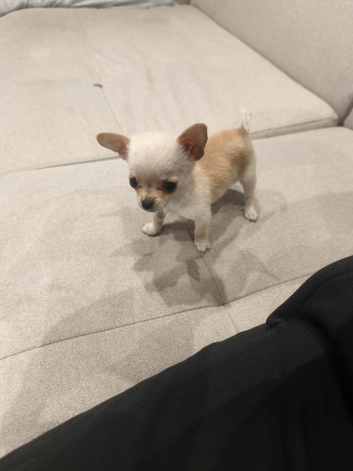 - "A small, fawn-and-cream colored Chihuahua puppy stands centered on a light beige upholstered sofa, facing forward and slightly left" by FM-BjNp73, licensed under CC BY 4.0