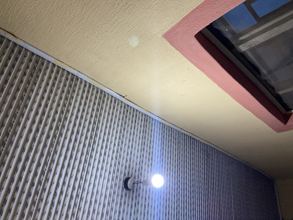 The image displays an upward-angled view of a building's structural elements within Ipetumodu, Nigeria. The upper-left diagonal section is occupied by a light-colored, horizontally corrugated panel ceiling. A single, illuminated white light bulb hangs by a cable from this ceiling, positioned in the upper-left quadrant. The lower-right diagonal section reveals a textured, light beige wall. Embedded within this wall, in the bottom-right corner, is a recessed rectangular opening or window frame, distinguished by a prominent pink-salmon colored trim. The interior of this opening appears dark. No people, actions, or interactions are visible.