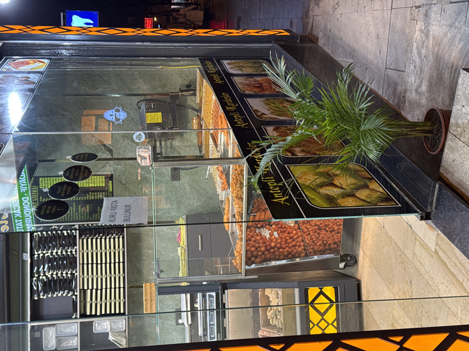 A shopfront displays a variety of pastries and desserts. The glass window showcases trays filled with baklava, small round sweets, and other confections. "Antepli Kardesler" is written in cursive on a black sign, and a potted green plant sits beside it. "Kuru pasta bulunur" is visible on a small white sign. Rows of packaged goods are arranged neatly on shelves.