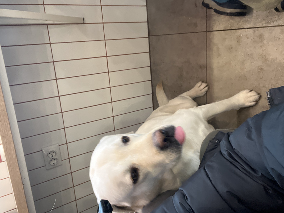 A light-colored Labrador Retriever sits on a tiled floor in an indoor establishment in Mytishchi, Russia