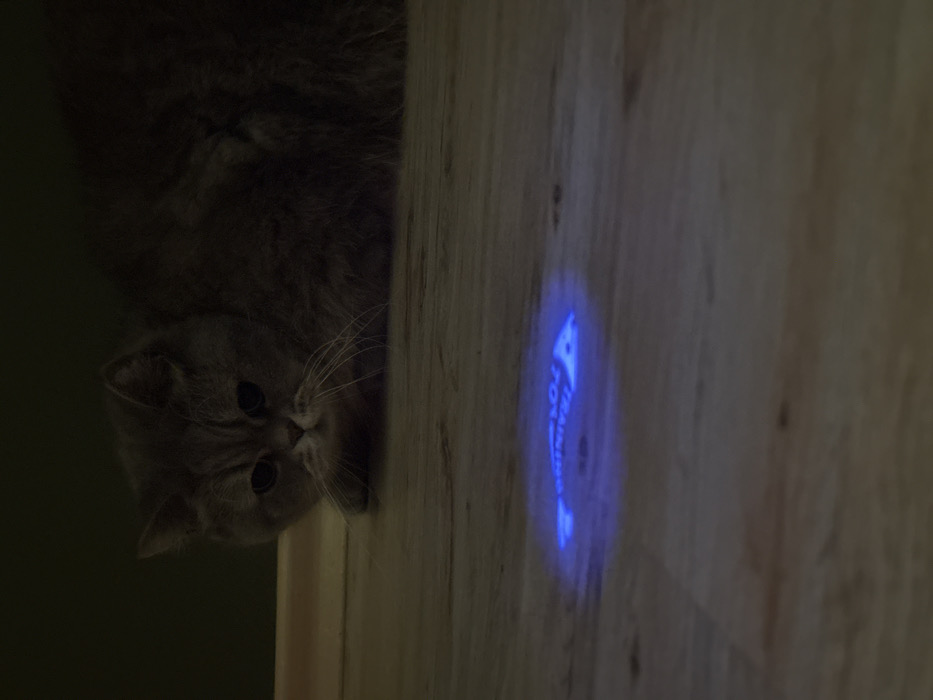 In a dimly lit interior setting in Marchaevo, Bulgaria, a grey, short-haired feline, likely a British Shorthair, is observed positioned low to the ground on a light-colored wooden floor. The cat's body is oriented towards the lower foreground, with its head slightly lowered, and its dark eyes are fixated on a circular blue light projection directly in front of it. Within this blue light, the words "TRAINING" and "701" are discernible, along with a distinct fish-like or arrow-like symbol. The floor exhibits visible wood grain patterns. The background consists of a uniformly dark, out-of-focus surface, possibly a wall. The scene is illuminated by low ambient light, with the blue projection serving as the most prominent light source in the immediate foreground. No human subjects are present. The cat appears to be engaged with or observing the projected light.