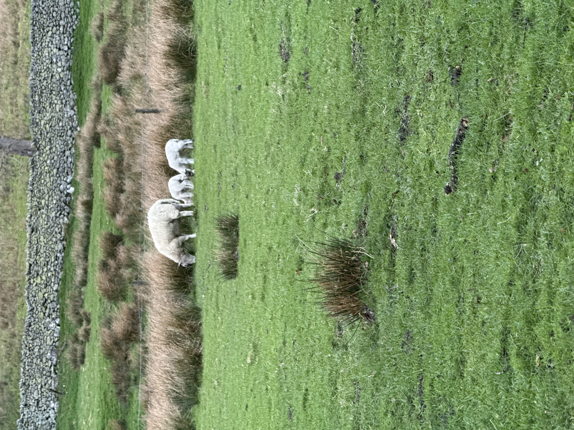 This image captures a pastoral scene in Glenridding, United Kingdom. The foreground features a vibrant green grassy field, with a small clump of dried brown rushes positioned centrally and a dark, fallen log lying horizontally in the lower right. In the midground, a white ewe with dense fleece is observed grazing, head down, facing left. Behind the ewe and slightly to its right, three smaller white lambs are also grazing. These animals are situated near a horizontal line of taller, dried brown grass and rushes, partially obscuring a thin wire fence with at least one dark post. The background reveals an ascending green hillside, marked by patches of similar dried vegetation. A dry-stacked stone wall runs horizontally across the upper background, behind which more green grass and the weathered, bare trunk of a tree are visible on the distant slope. The scene is illuminated by diffuse, overcast light.