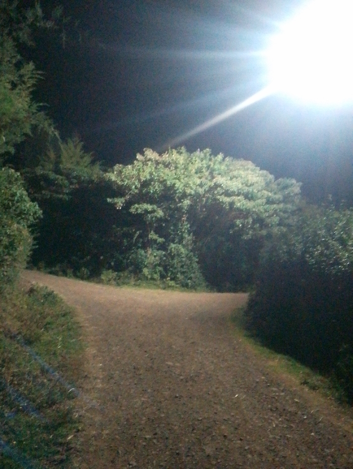 dirt road branching into two paths at night in Ihururu, Kenya, at coordinates -0.392 latitude, 36.895 longitude. The road is illuminated by a bright light source located off-frame, casting strong rays across the image, making the background appear dark. The road is lined by foliage and trees on both sides. The ground is covered in small gravel and dirt. No people are visible in the image.