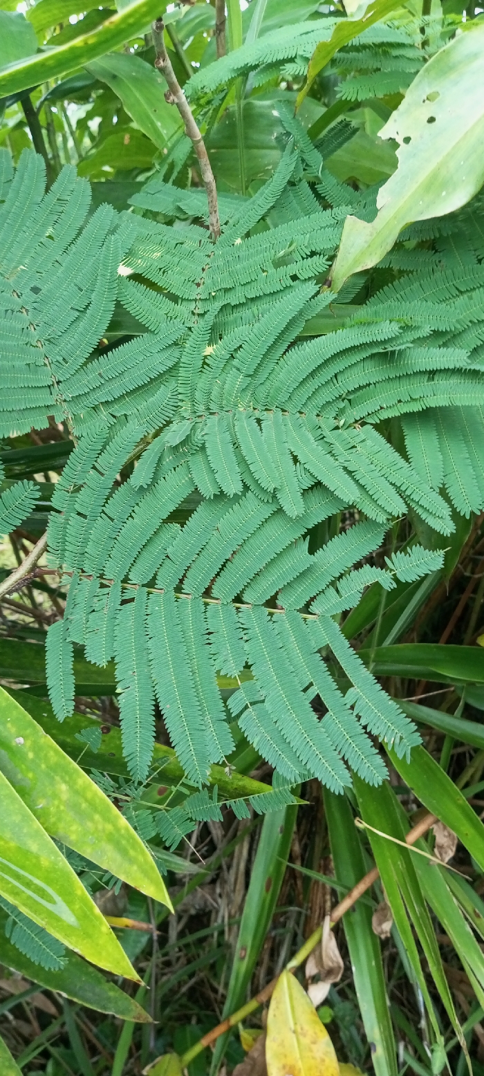 Lush green foliage dominates the frame. Mimosa-like leaves with numerous leaflets extend horizontally. The leaves are bright green with a finely textured surface. Background vegetation includes broad, lance-shaped leaves and slender stems. Sunlight illuminates sections of the leaves, creating highlights. There are also some dead leaves on the ground.