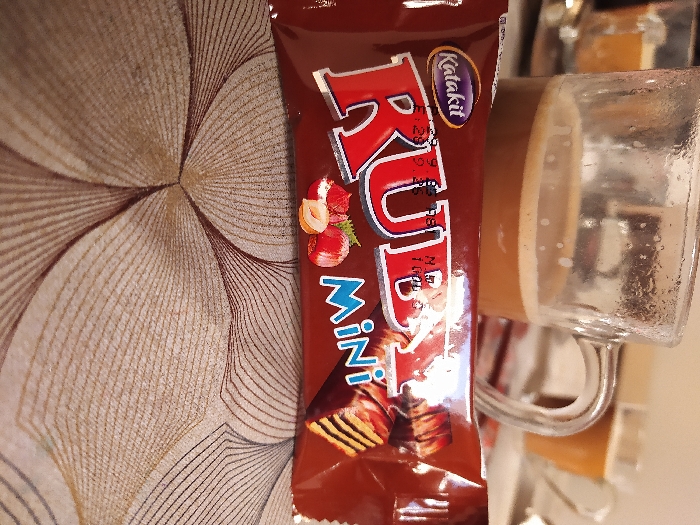 An indoor scene in Unknown, Unknown, displays a close-up of a Katakit RUBI Mini chocolate bar package in the foreground, positioned horizontally