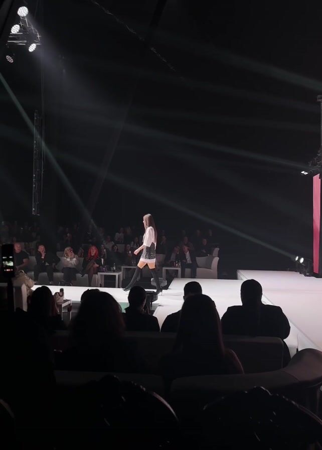 The scene is set at a fashion show, with a runway extending into the viewing area. A lone model strides down the bright white runway, illuminated by spotlights that create a dramatic effect against the dark background. Spectators fill the seats surrounding the runway, their silhouettes visible against the dim backdrop. Some hold up phones to capture the moment. Stage equipment, including lighting rigs, frames the scene, emphasizing the structured and theatrical atmosphere.