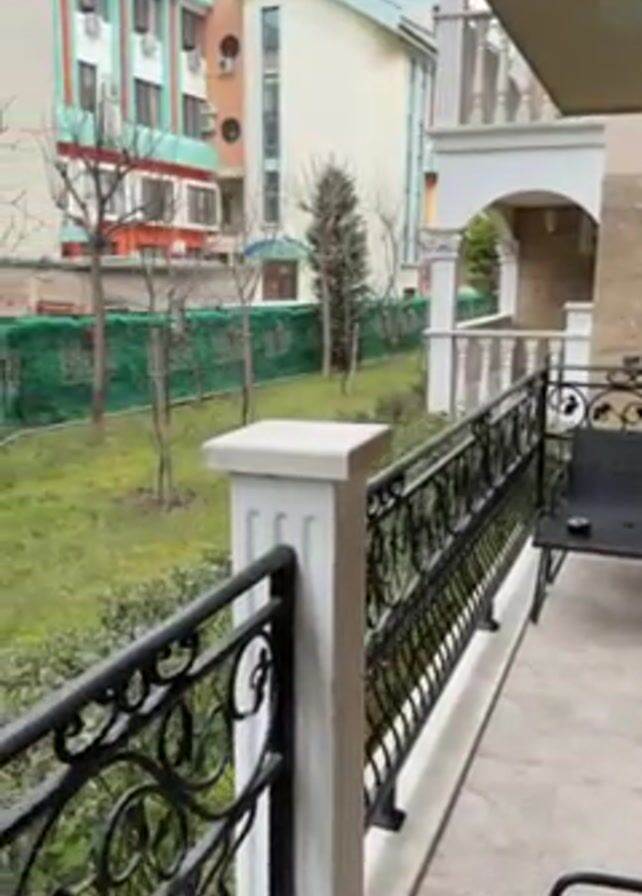 small balcony with ornate black wrought iron railings and white pillars. A bench and chair sit on the tiled balcony. The view from the balcony looks out onto a grassy lawn area lined with green privacy netting along a fence. A few bare trees and some evergreen shrubs are scattered across the lawn. A multi-story building is visible in the background, with a pastel color scheme and multiple air conditioning units mounted on its exterior. The sky appears overcast.