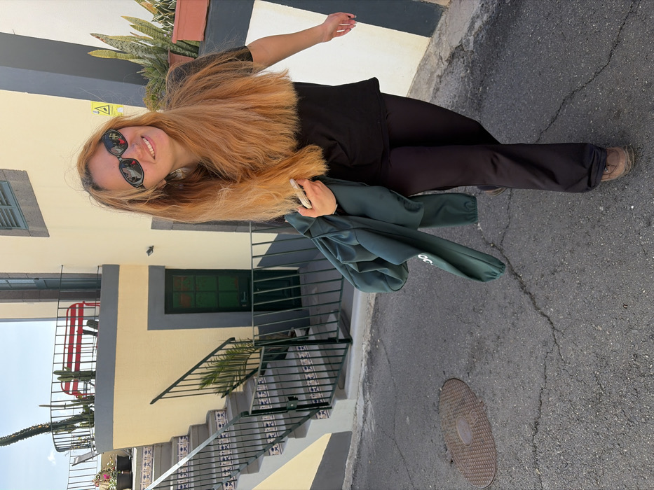 The image portrays an outdoor scene on an asphalt street in Câmara de Lobos, Portugal. A young adult female with long, reddish-blonde hair is depicted walking forward, smiling and looking towards the viewer. She wears black sunglasses, a black short-sleeved top, black flare-leg pants, and brown lace-up shoes. She carries a dark green jacket or sweatshirt folded over her left arm and holds a white smartphone in her left hand. To the subject's left, a light yellow building with dark grey trim features a dark green, multi-paneled door at ground level. An exterior staircase with patterned risers and dark metal railings ascends alongside this building. Above the staircase, a balcony with similar dark metal railings is visible, furnished with a red slatted bench and potted plants, including a tall, columnar cactus. To the subject's right, a building wall is painted in sections of white and dark grey/black. Potted succulents and cacti are arranged on a ledge along this wall. A yellow triangular warning sign with black symbols is affixed to the dark grey section of the wall. A window with dark louvred shutters is visible higher up. The street surface exhibits visible cracks, and a circular metal manhole cover is located in the lower-left foreground. The scene is illuminated by bright daylight, casting clear shadows.