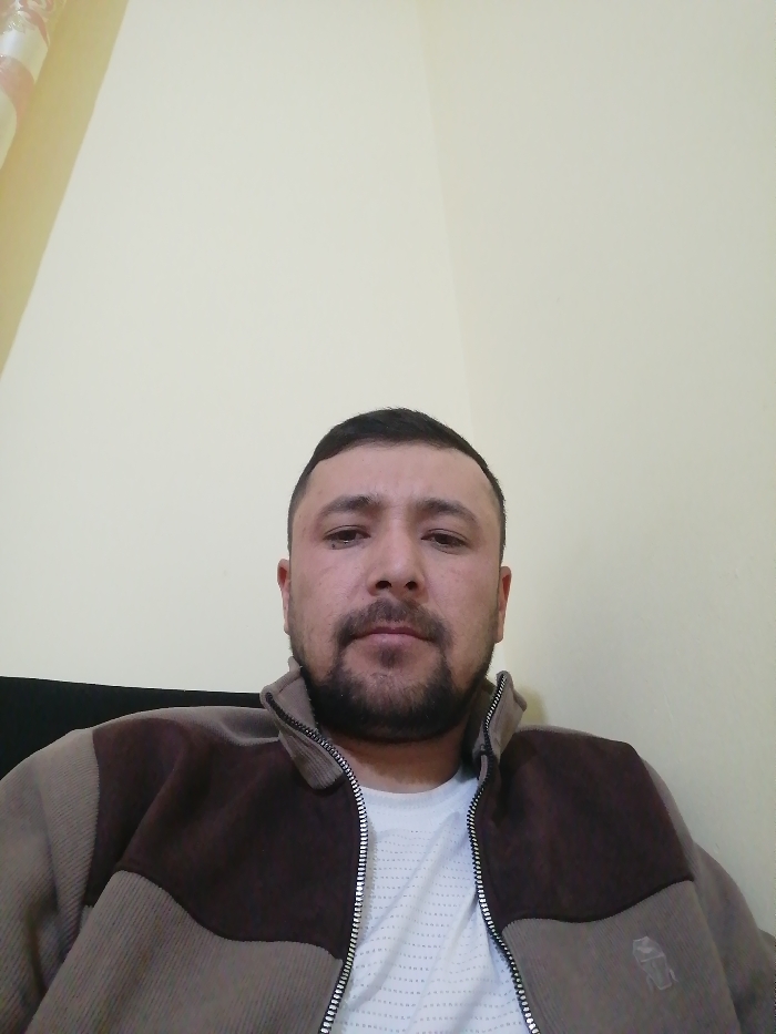 A close-up, chest-up portrait depicts an adult male with short, dark hair and a trimmed dark beard, looking directly at the camera with a neutral expression. A subtle mark is visible on his upper right cheek. He is wearing a two-tone zippered jacket, dark brown on the upper portion and light brown on the lower, with a partially visible silver-colored zipper. A white, textured t-shirt is visible underneath the jacket. The subject is positioned indoors against a plain, light cream-colored wall, with a dark surface partially visible behind his left shoulder. The environment provides no further specific identifying details. The scene occurs in the city of Samarkand, Uzbekistan.