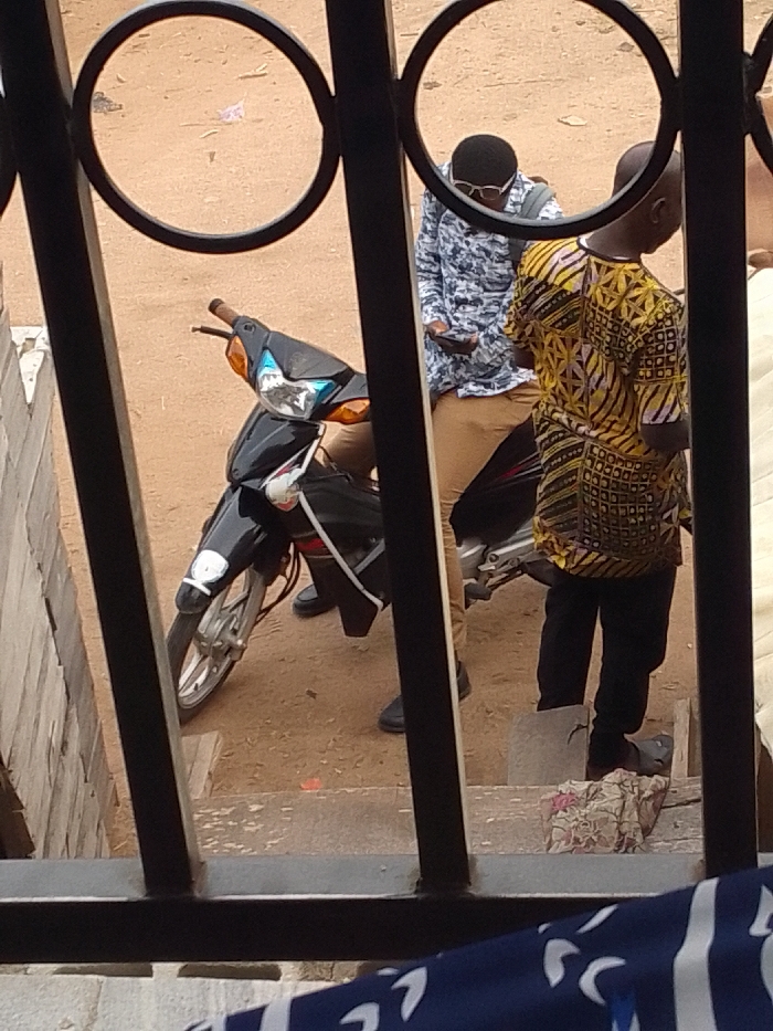 The scene depicts an outdoor unpaved area in Zango-ndaji, Nigeria, viewed from an elevated perspective through a black metal railing featuring vertical bars and three circular motifs