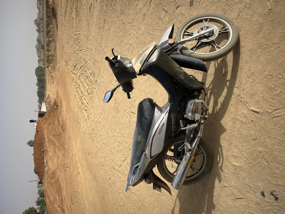 A Keeway motorcycle lies sideways on a dusty, dirt-covered ground