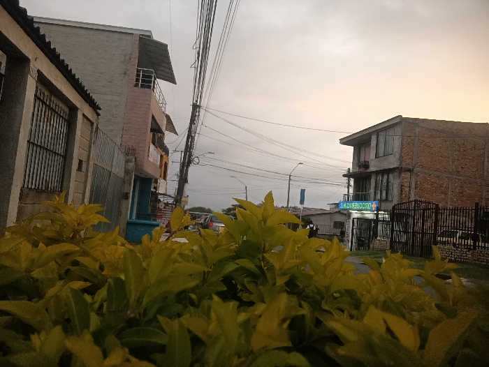 A street scene under a cloudy sky with buildings on either side. One building is primarily brick with an illuminated sign reading "DROGUERIA Y.C." in reverse. A neighboring building is white and pink with balconies. Power lines crisscross overhead. Lush green bushes fill the foreground, partially obscuring the street. A black metal fence fronts the building with the sign. Cars are visible parked behind the fence and further down the street.
