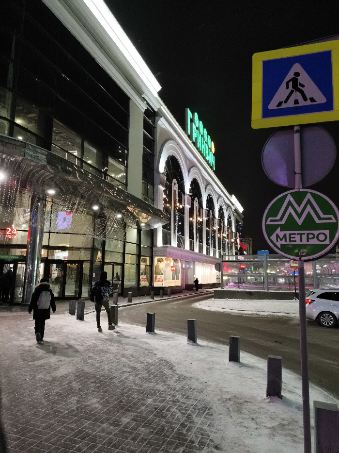 A snowy street scene at night features two pedestrians walking away from the camera towards a large building with illuminated windows and arched structures. Overhead signs indicate a pedestrian crossing and the metro station. The sky is dark, and there is snow on the sidewalk and road. A white car is parked to the right, further back in the frame. The building has a modern façade with visible store signs inside.
