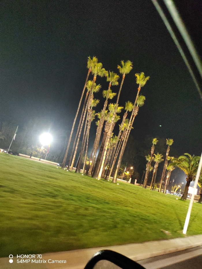 A nighttime scene reveals a large grassy area lined with tall palm trees, illuminated by strategically placed lights. The trees vary in size and are silhouetted against the dark sky. A bright light source, possibly a spotlight, is visible in the distance. The photograph appears to be taken from a moving vehicle, with a partial view of the car's interior visible in the foreground. The atmosphere is tranquil and elegant.