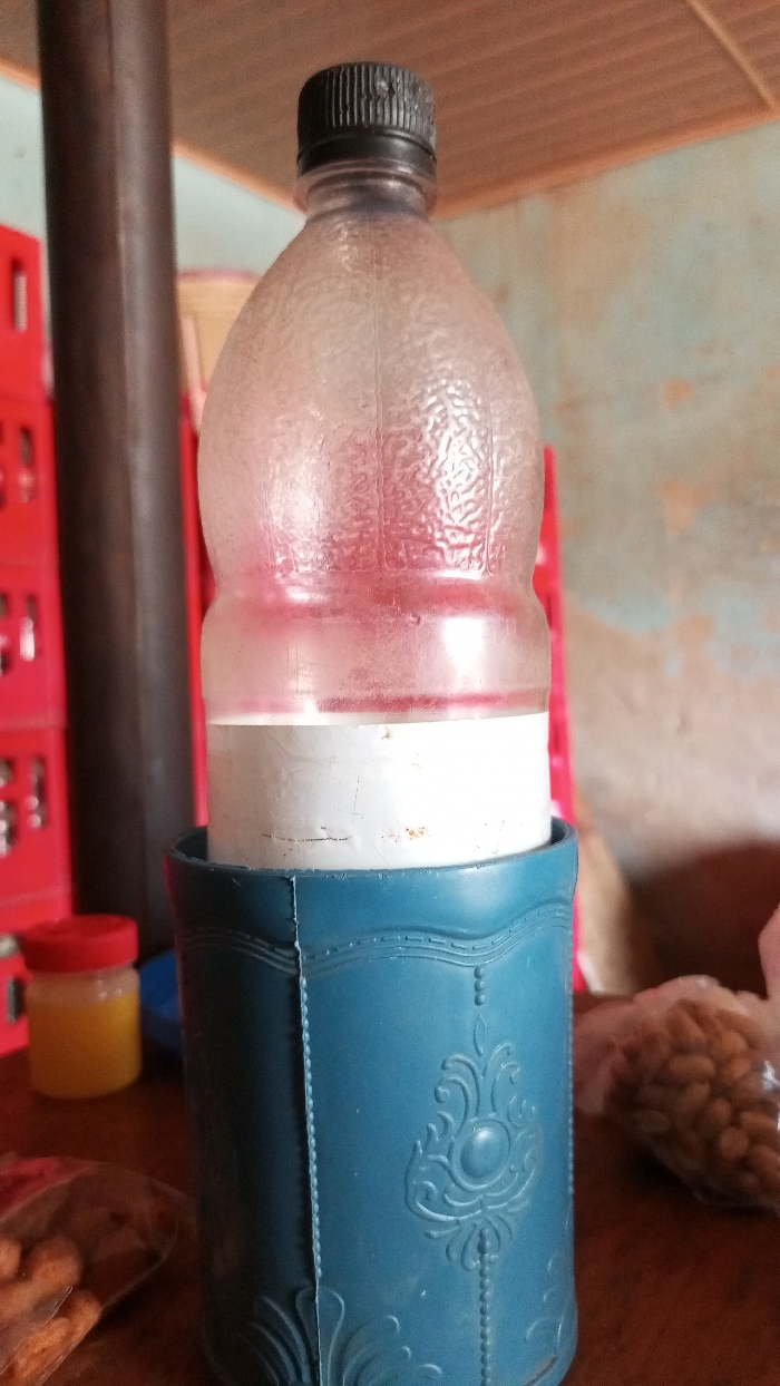 A clear, textured plastic bottle, approximately half-filled with a reddish liquid, is depicted in an indoor setting in Sabon Tasha, Nigeria