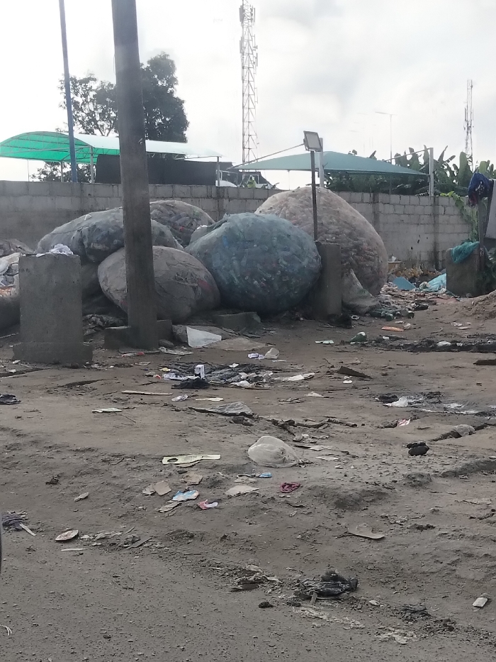 littered outdoor area with large bags filled with recyclable materials stacked against a wall. Discarded paper, plastic, and other debris are scattered on the ground. A utility pole stands in the foreground. In the background, there are green awnings and communications towers are visible. The scene suggests an informal recycling or waste management site.