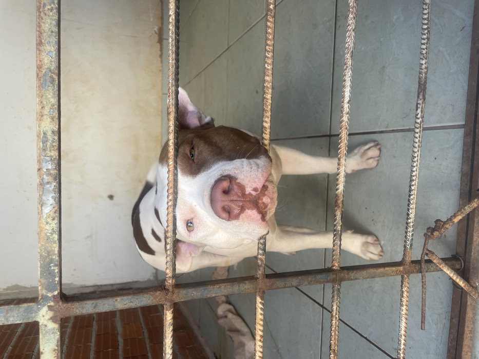 The image displays a Pit Bull type dog, predominantly white with brown patches, standing behind a rusty metal rebar gate