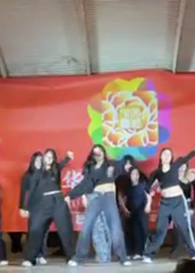 A group of about 10 young women are dancing on a stage. They are wearing mostly black tops and baggy pants. Behind them is a large orange banner with a colorful flower design and Chinese writing. In front of the stage, people are watching and filming the performance, including a person in a yellow safety vest. The stage is covered by a roof and has lighting equipment on the left.