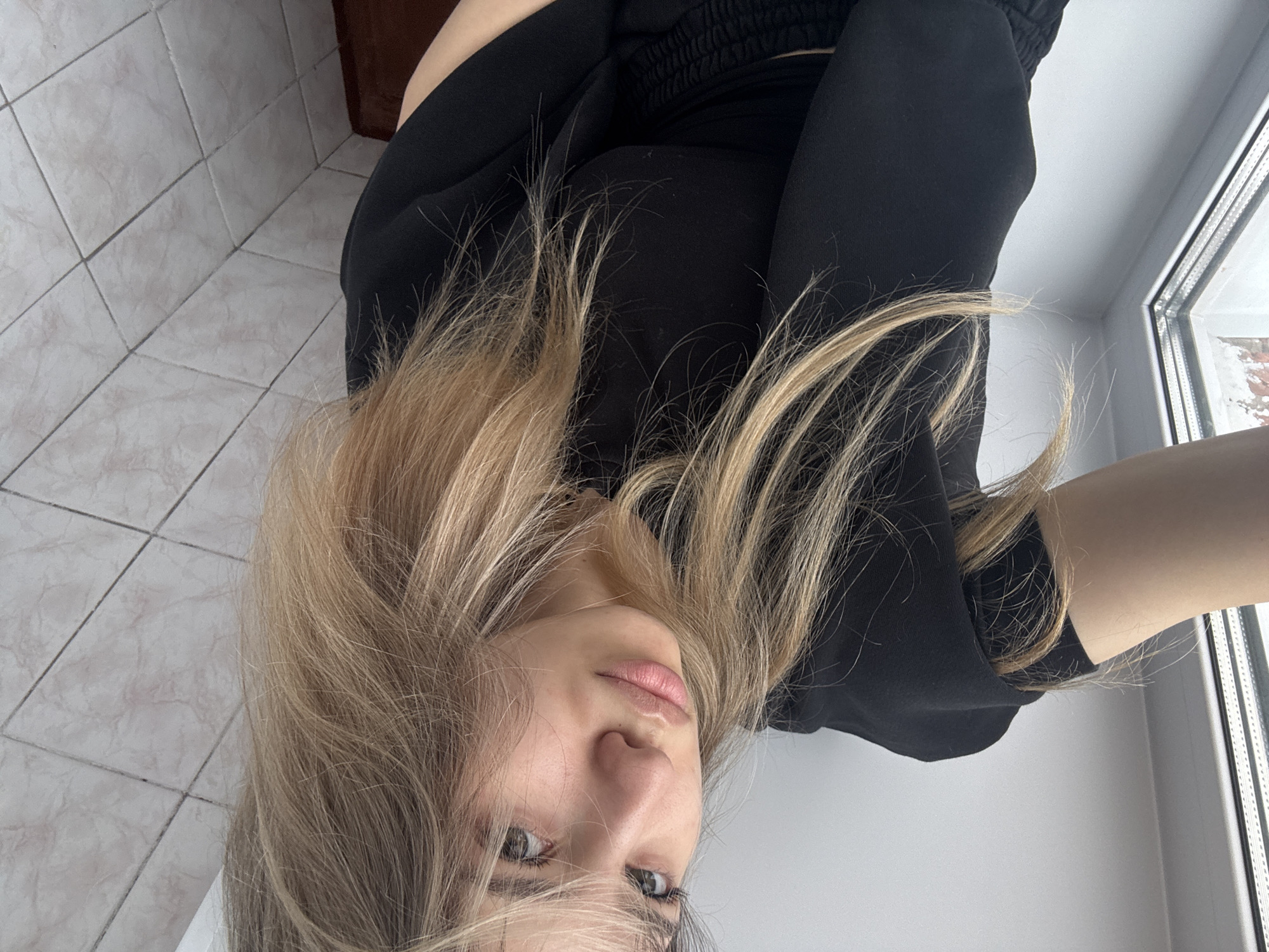 A young woman with blonde hair and fair skin is depicted in a close-up, slightly angled view. She is wearing a black top with a gathered neckline and a black jacket. The background shows a tiled floor in shades of beige and white, a section of a dark wooden object, and a window with visible exterior details suggesting winter conditions. The location is likely residential, but the specific city, Noviy, Russia, cannot be verified from the image alone. No specific actions or interactions are visible, the focus is on the woman's appearance within an indoor setting.
