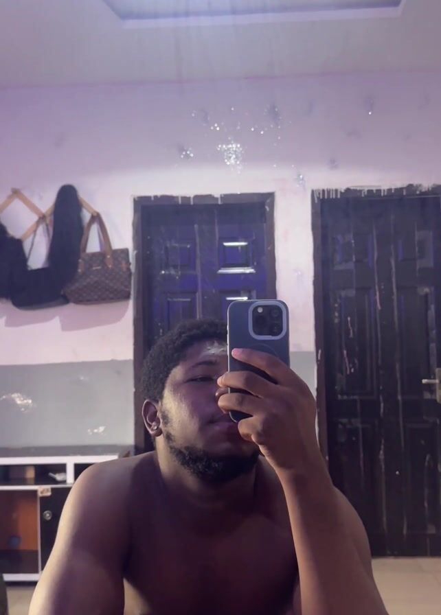 A shirtless man with a beard and short dark hair is taking a selfie in a mirror. He is holding a blue smartphone in his right hand, obscuring part of his face. Behind him, there is a dresser, a green door, and a dark wooden door. A couple of bags are hanging on the wall. The light from above is reflected in the mirror.