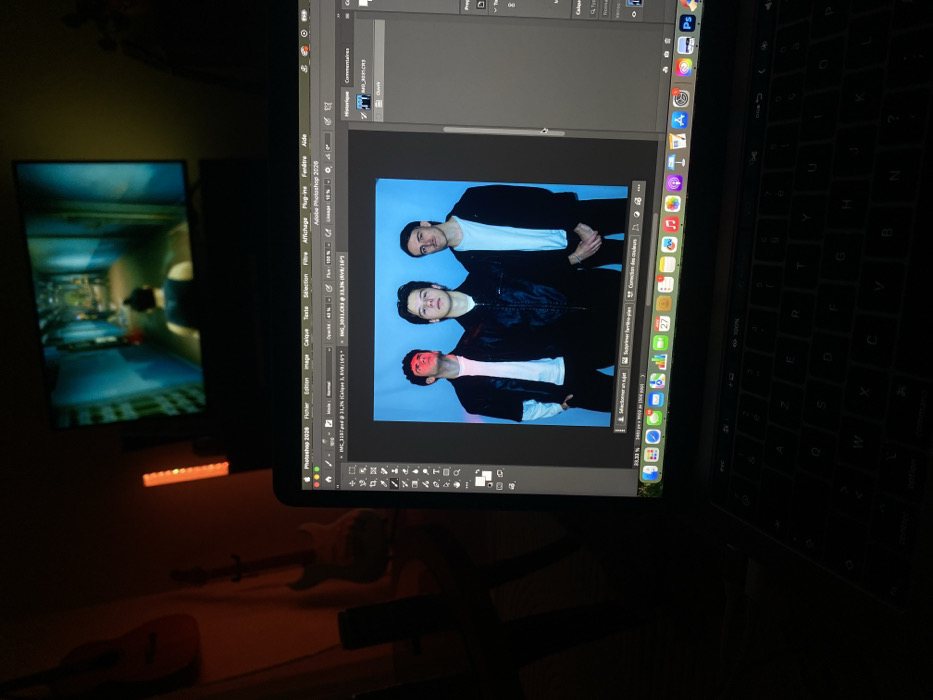 A dimly lit room features a laptop screen displaying an image of three men standing vertically against a light blue background. The image is open in what appears to be Adobe Photoshop. A TV screen showing a blurry interior scene is visible on the wall. Below the screens, a guitar and ukulele are partially visible. The laptop keyboard is also in view, adding to the composition's depth.