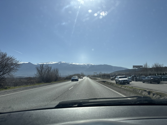 This image presents a daytime, forward-facing view from inside a vehicle on a road in or near Piperevo, Bulgaria. The lower foreground displays a portion of a dark dashboard and the base of the windshield. The asphalt road extends into the distance, featuring a solid white line on the left edge and a dashed white center line. Multiple vehicles are observed traveling in the same direction, with a distinct blue sedan visible in the left lane further ahead. To the right of the main road, a paved service area or parking lot is present, separated by a concrete curb. This area contains several parked vehicles; a white SUV is prominently positioned, facing the camera with its driver's side door open. Behind these vehicles, a black sign with white lettering displays "SAMARDJIEV AUTO". Sparse, bare trees and dry vegetation line both sides of the roadway. The background is dominated by a clear, bright blue sky, exhibiting significant sun glare and lens flares in the upper center. A distinct white airplane contrail is visible in the upper-left sky quadrant. Below the sky, a range of snow-capped mountains stretches across the horizon. No individuals are visible in the scene.