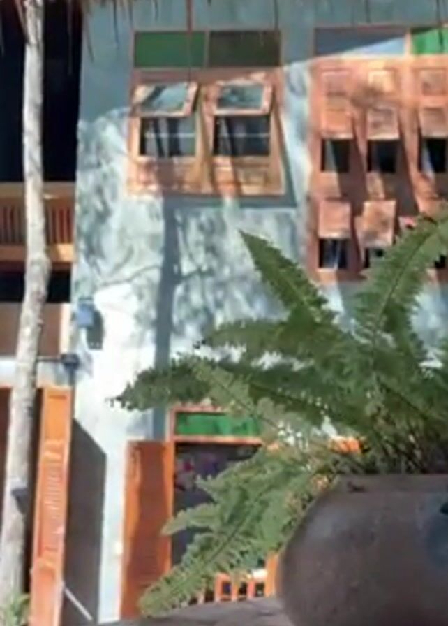 A static, close-up shot shows a fern in a mottled brown ceramic pot, set on a roughly-hewn wooden table or surface. Behind the fern and partially obscured by the tree foliage creating dappled shadows, a gray, multi-story building is visible. The building features wooden window frames, some with their shutters open. The windows are adorned with colored glass panels. A thatched roof provides partial cover for the viewpoint. In the distance, a person is seated at a table within an open area with wooden railings and supports. An air conditioning unit is visible on the building's exterior.