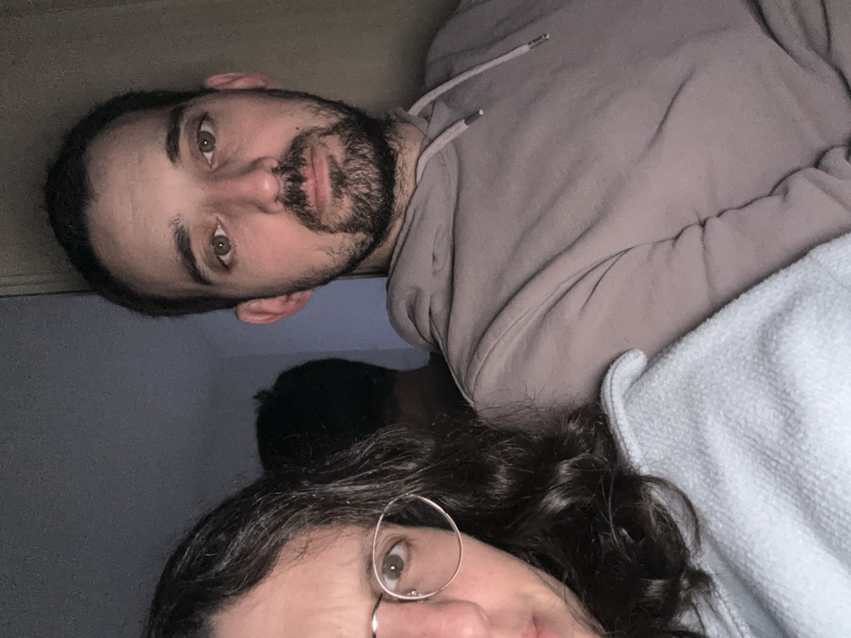 The image displays two individuals in an indoor setting in Raanana, Israel, under dim illumination. On the left, a female subject is partially visible, showing dark, curly hair and wearing gold-rimmed round spectacles. Her left eye is directed towards the camera, and she is clad in a light blue textured garment. On the right, a male subject is visible from the head to the waist. He has short dark hair and a short beard, wearing a light brown hooded sweatshirt with a visible drawstring. His eyes are directed towards the camera. In the background, behind the female subject, a dark, indistinct reflection of a third individual's head and shoulders, oriented away from the camera, is faintly visible. The immediate background elements consist of unidentifiable wall or door surfaces.