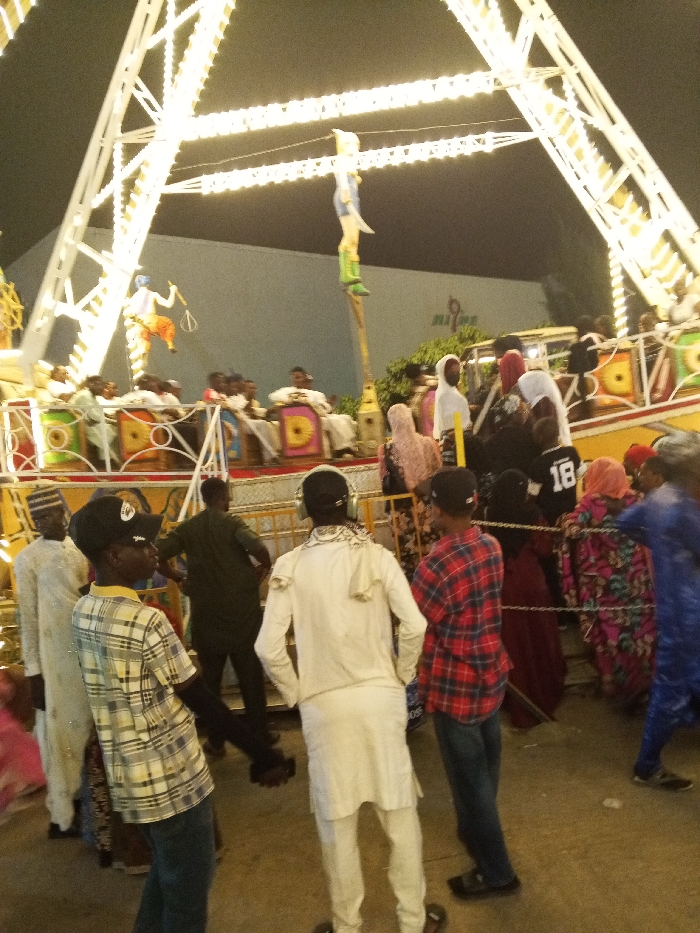 A vibrant scene unfolds at what appears to be an amusement park at night. A Ferris wheel with decorative figures and lights is visible. People are seen riding the wheel while others, dressed in various attires, are gathered below watching. The crowd includes individuals in traditional clothing and casual wear, suggesting a diverse community enjoying the entertainment. A white wall with "Jime" is visible in the background.