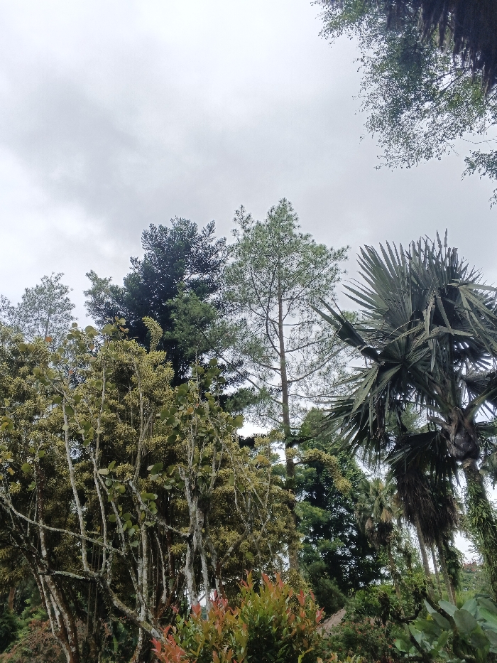 A variety of trees fill the frame against an overcast sky. A palm tree with large, fan-shaped leaves stands to the right. A tall pine tree with a slender trunk rises in the center. To the left, trees with lighter green foliage and numerous small branches intermingle. Red-tinged shrubs are visible at the base of the trees, adding a touch of color. The overall scene suggests a diverse and lush natural environment.