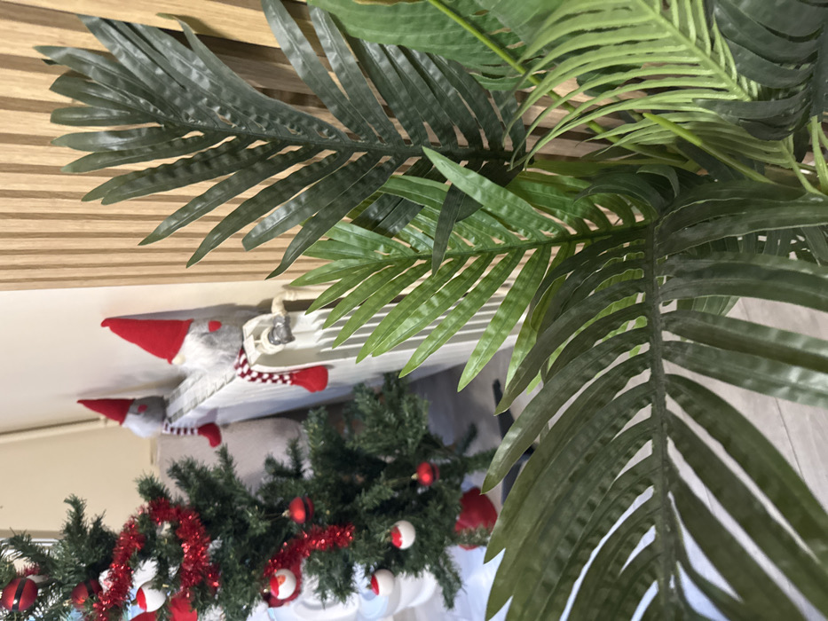 The image displays an indoor scene decorated for the holidays. In the foreground, several artificial palm fronds of varying shades of green occupy the right side of the frame. In the midground, a white, multi-finned radiator is visible. Two plush gnome figures are seated on top of the radiator. Each gnome features a gray body, a red conical hat, and red dangling legs; one gnome is also wearing a red and white striped scarf. To the left of the radiator, a small artificial Christmas tree is decorated with red tinsel garland and spherical ornaments in red and white. A white, possibly ceramic, figure is partially visible at the base of the Christmas tree. The background consists of a plain, light-colored wall behind the radiator and tree, and a section of a vertical wooden slatted wall to the right of the radiator. The floor, visible at the bottom left, is light-colored. No individuals or specific actions are depicted. The exact location within the city of Caen, France, cannot be determined from the visual information provided.