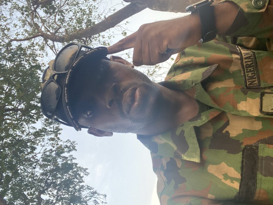 A low-angle shot features a person in a Nigerian military camouflage uniform