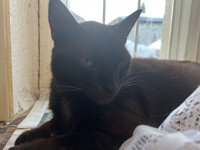 The image displays a black domestic cat situated indoors in Kolomna, Russia. The cat is lying down, positioned on a surface, likely a windowsill. Its head is turned slightly to the right, with its visible left eye exhibiting a light-colored iris and its gaze directed towards the viewer. White whiskers are prominent on the left side of its muzzle. Underneath the cat's left paw and body, a piece of newspaper is visible. To the right, a white lace textile partially covers the cat's lower body. The background consists of a window, through which a blurred outdoor winter scene is discernible, showing what appears to be snow on distant structures or ground under soft daylight. The window frame is present, and a bright backlight from the exterior renders the cat's fur largely underexposed. A textured, light-colored wall or window casing with some discoloration is visible on the left side of the frame.