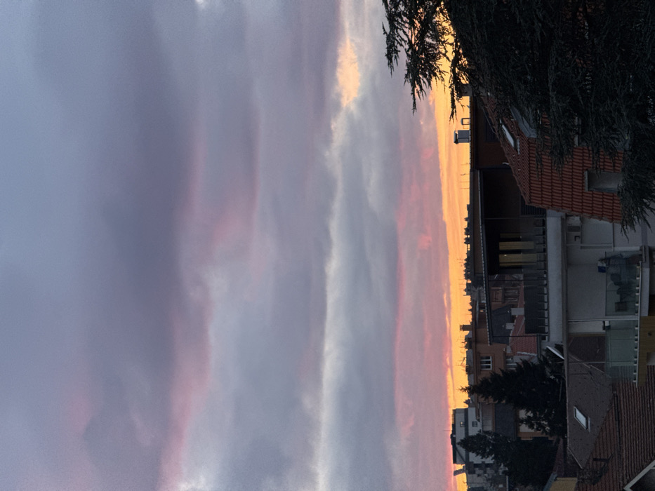 The image presents a sunset view over a cityscape. The sky is a blend of pale blues and purples with streaks of orange and pink where the sun is setting. The silhouettes of buildings and trees are visible against the colorful sky, primarily to the right of the image. There is a tree in the foreground. The view is from an elevated perspective, likely a balcony or a high window.