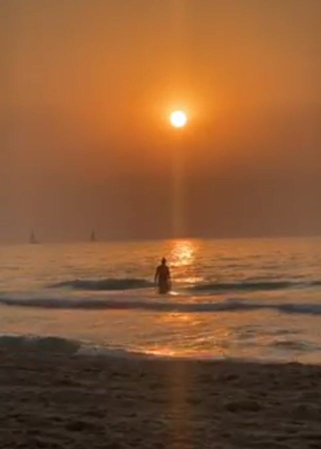 beach at sunset, with a hazy orange sky above the ocean. The sun, a bright orange orb, is positioned high in the sky, casting a shimmering reflection on the water's surface. Small waves gently roll towards the sandy beach in the foreground. A silhouetted figure stands in the water, waist-deep, facing towards the sun. In the distance, two sailboats are visible on the horizon.