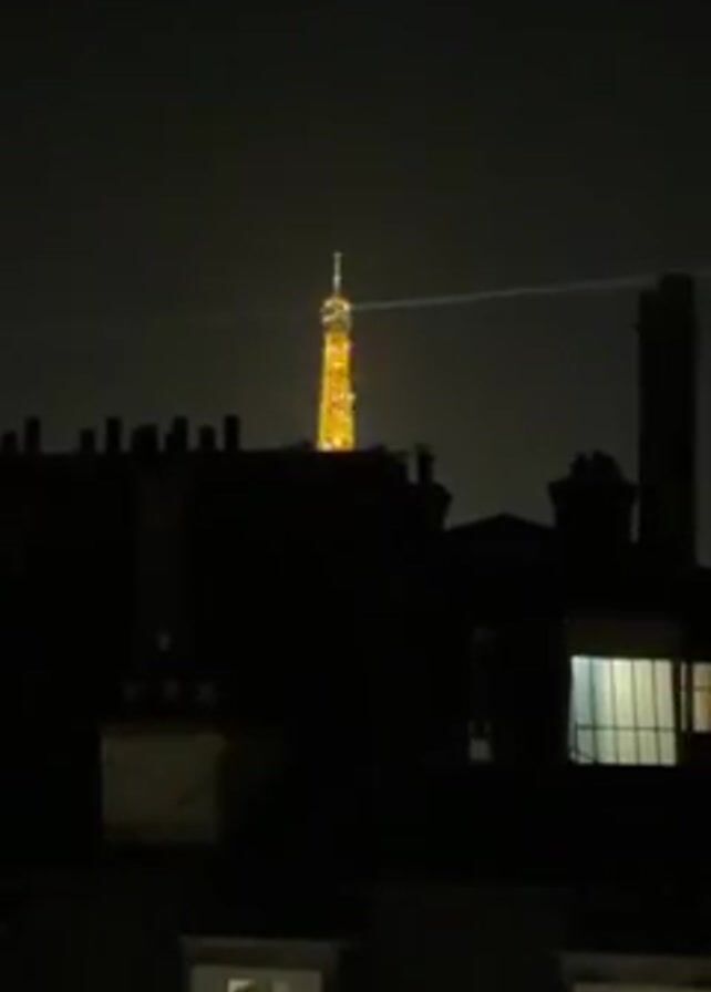 At night, the Eiffel Tower is visible, lit up in gold, through the rooftops of buildings. The rest of the scene is dark and silhouetted. The camera is still.