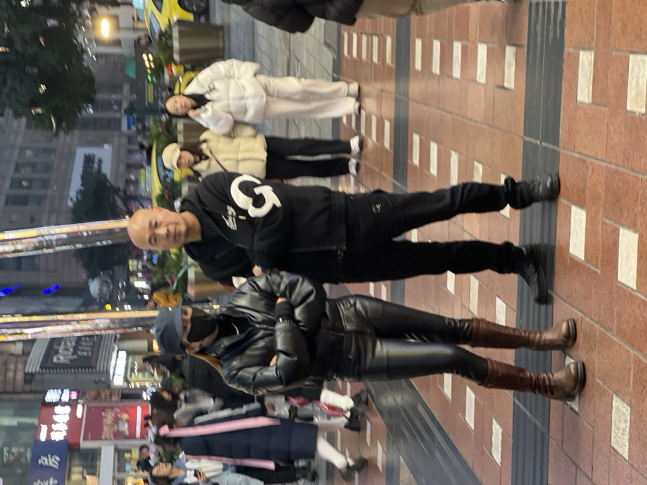 The image captures an urban street scene in Yuzhong District, China, during evening hours, illuminated by artificial light. In the foreground, two individuals stand side-by-side, posing with their arms crossed. The female on the left wears a dark baseball cap, a black face mask, a black shiny puffer jacket, form-fitting black leather trousers, and tall brown leather boots. The male to her right is bald, dressed in a black zippered hoodie featuring a white stylized "G" or similar emblem on the left sleeve, dark pants, and dark shoes. Both individuals are looking towards the camera. In the background, a bustling street environment unfolds with numerous pedestrians. Visible figures include a woman in a light beige puffer jacket and cap, and another in a white puffer jacket and white pants, located to the right of the main subjects. A yellow taxi cab is partially seen on the street behind them. The background features commercial buildings adorned with illuminated signage, displaying Chinese characters (e.g., "瑞安府," "美团") and some English text. The ground is paved with a distinctive pattern of reddish-brown and darker-colored tiles, interspersed with lighter square segments.