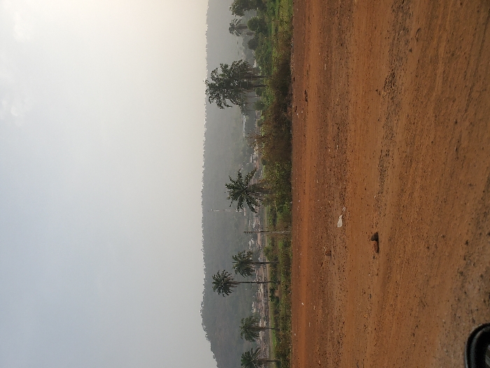 This image depicts an outdoor landscape within Koton Karifi, Nigeria, captured under a pale, hazy sky. The foreground is comprised of reddish-brown, unpaved earth, featuring visible tracks and sparsely scattered debris, including a white plastic bag and a dark, amorphous object. A band of green foliage, prominently featuring several tall palm trees, traverses the midground. Behind this vegetation, low-rise structures of a settlement are faintly visible, with a slender communication mast rising above the treeline on the left side. The background is dominated by a substantial, tree-covered hill range that recedes into the atmospheric haze. A segment of a vehicle's side mirror is visible in the bottom-left corner of the frame. No individuals are present.