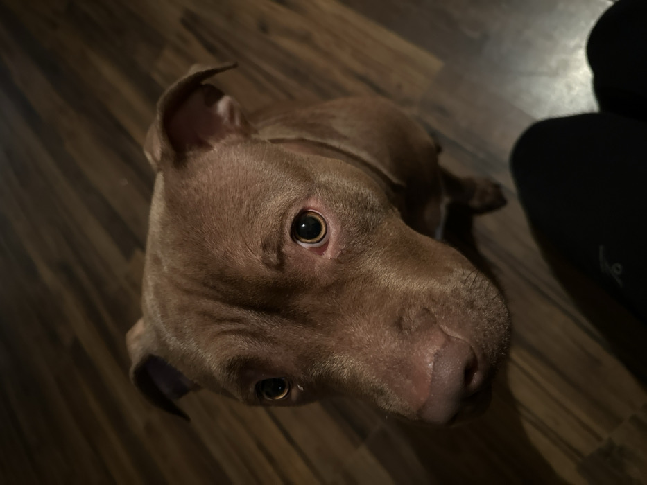 - "An indoor scene features a brown-coated canine, consistent with a Pitbull-type breed, positioned centrally and looking directly upward towards the camera" by FM-gsE632, licensed under CC BY 4.0