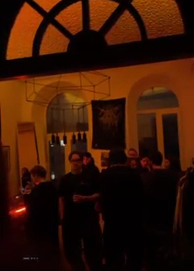 group of people in a dimly lit room. The room appears to be a gathering place, possibly a bar or lounge. The people are standing and conversing. The lighting is warm, with orange tones. There is a large arched window above the group. A banner hangs on the wall. A geometric light fixture hangs from the ceiling. Someone is taking a video of the scene with their phone.